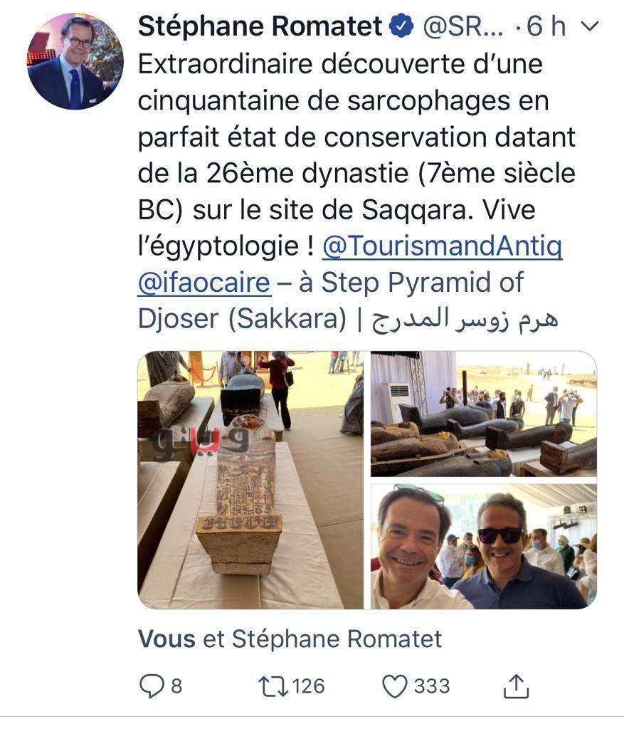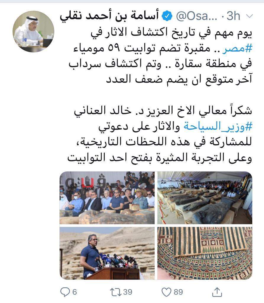ومن جانبه وجه سفير المملكة العربية السعودية، عبر تغريدته، الشكر إلى وزير السياحة والآثار لتقديم الدعوة له لحضور الإعلان عن هذا الكشف العظيم وعلي المشاركة في هذه اللحظات التاريخية ومشاهدة التجربة المثيرة لفتح أحد التوابيت، واصفا اليوم بالهام بالنسبة للاكتشافات الأثرية.