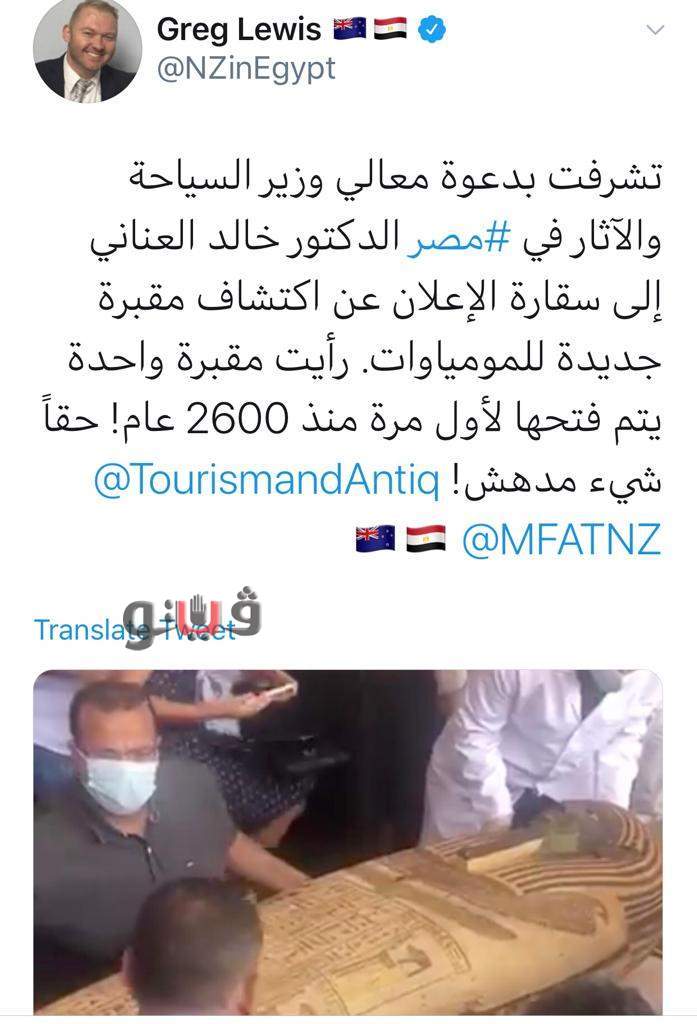 وغرد سفير دولة نيوزيلندا لدى القاهرة عبر حسابه الرسمي على تويتر معربا عن اندهاشه برؤية مومياء لأول مرة عندما تم فتح أحد التوابيت التي وجدت بداخله.
