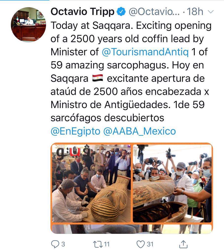 وأعرب سفير دولة المكسيك في تغريدته عن سعادته بعملية فتح أحد التوابيت المكتشفة أمامه لأول مرة، كما غرد سفير دولة فرنسا واصفا الكشف بأنه رائع وغير عادي حيث تم العثور على ٥٩ تابوتا في حالك جيدة من الحفظ.