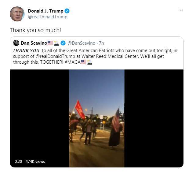 𝙏𝙃𝘼𝙉𝙆 𝙔𝙊𝙐 to all of the Great American Patriots who have come out tonight, in support of @realDonaldTrump at Walter Reed Medical Center. We’ll all get through this, TOGETHER! #MAGA🇺🇸🦅 pic.twitter.com/MkM1XWSpdQ— Dan Scavino🇺🇸🦅 (@DanScavino) October 4, 2020