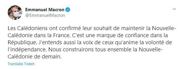 وكتب إيمانويل ماكرون تغريدة على تويتر قال فيها: "أكد سكان كاليدونيا رغبتهم في إبقاء كاليدونيا الجديدة في فرنسا. إنها علامة ثقة في الجمهورية. كما أسمع أصوات أولئك الذين تحركهم الرغبة في الاستقلال. سنبني معًا كاليدونيا الجديدة غدًا".