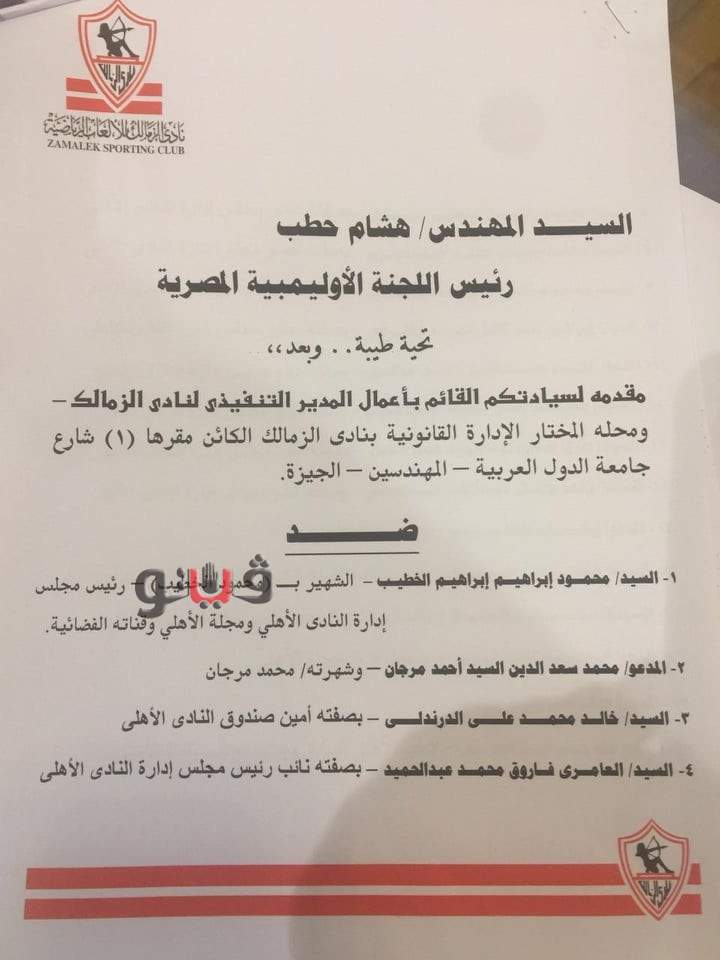 تلقت اللجنة الاولمبية شكوى رسمية من نادي الزمالك ضد محمود الخطيب رئيس النادي الأهلي ومحمد مرجان مدير النادي الأحمر والعامري فاروق نائب رئيس النادي وخالد الدرندلي أمين الصندوق، وتضمن الشكوى توجيه السباب للقلعة البيضاء ومرتضى منصور رئيس النادي.