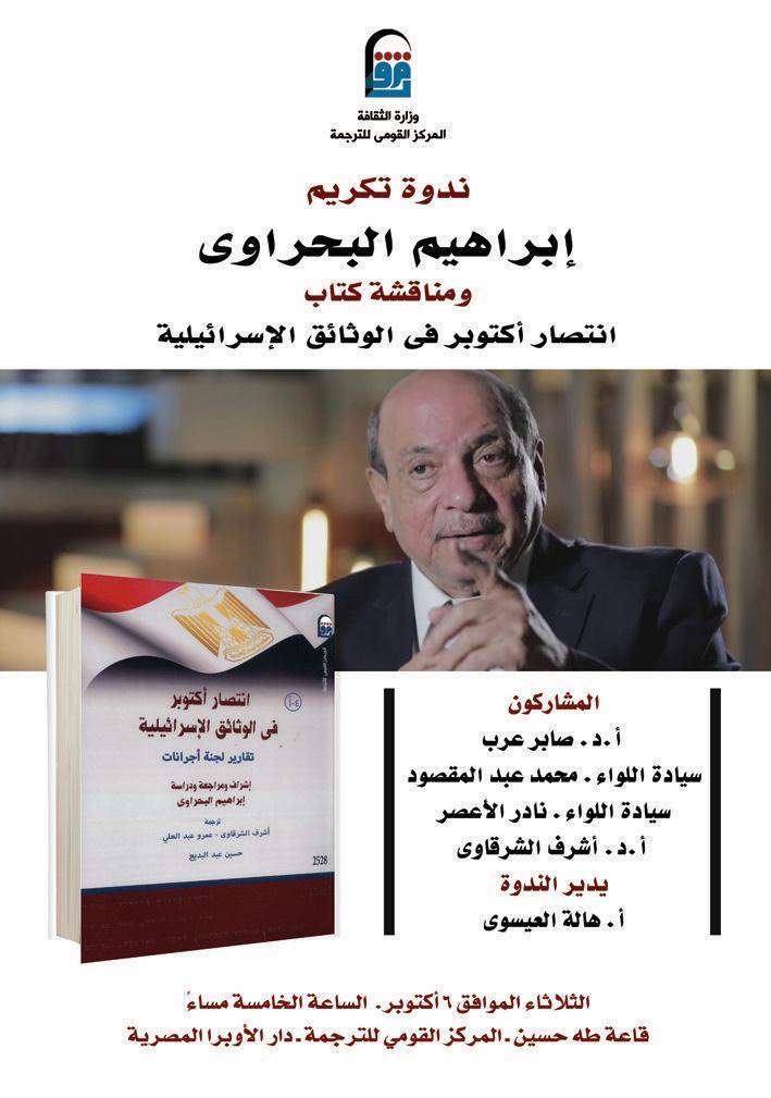 ينظم المركز القومي للترجمة، برئاسة الدكتورة كرمة سامي، ندوة تكريم ومناقشة كتاب "انتصار أكتوبر في الوثائق الإسرائيلية" للدكتور الراحل إبراهيم البحراوي.