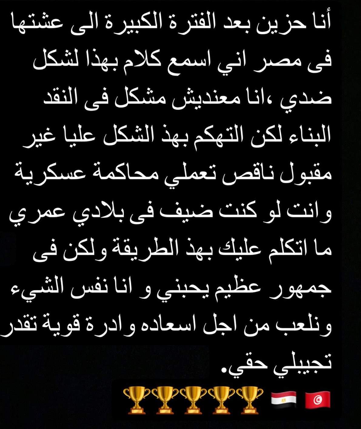 وكتب فرجاني ساسي عبر حسابه الشخصي على موقع "تويتر"، قائلا: "أنا حزين بعد الفترة الكبيرة اللي عشتها في مصر إني أسمع كلام بهذا الشكل ضدي، أنا ما عنديش مشكلة في النقد البناء لكن التهكم بهذا الشكل عليا غير مقبول ناقص تعملي محاكمة عسكرية".