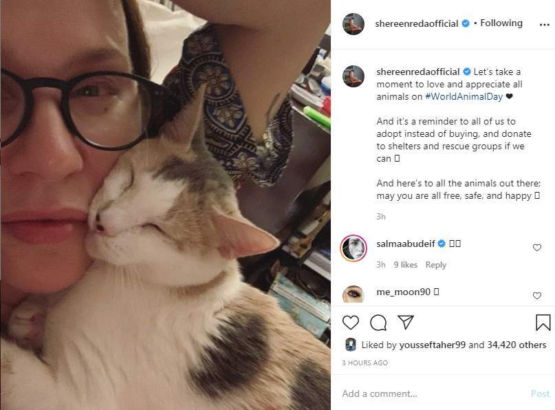 ونشرت شيرين رضا صورة لها مع قطة، وعلقت عليها: "دعونا نتوقف لحظة، لنحب ونقدر جميع الحيوانات في اليوم العالمي للحيوانات.. وهو تذكير لنا جميعًا بالتبني بدلاً من الشراء والتبرع لجميع الملاجئ".