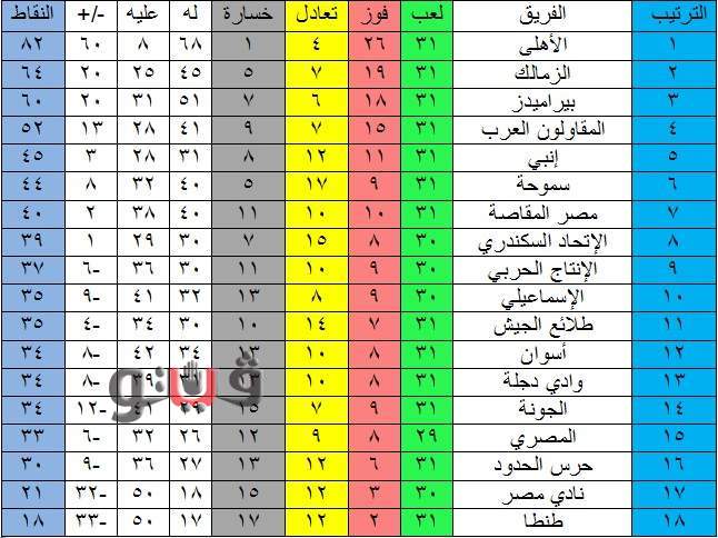 جدول ترتيب أندية الدوري الممتاز بعد انتهاء الجولة 31