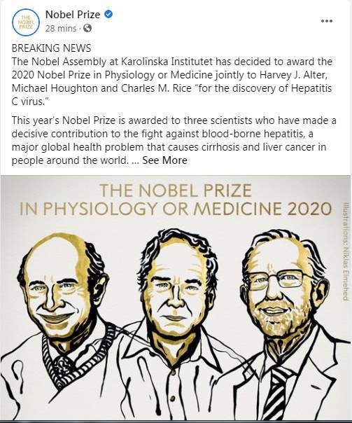 أعلنت الصفحة الرسمية لجائزة نوبل، عبر الفيس بوك، أن جمعية نوبل في معهد كارولينسكا منح جائزة نوبل لعام 2020 في علم وظائف الأعضاء أو الطب بشكل مشترك لهارفي جي ألتر ومايكل هوتون وتشارلز إم رايس لاكتشاف فيروس التهاب الكبد الوبائي سي.