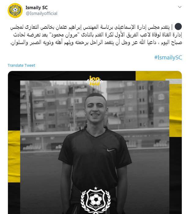أكد نادي الاسماعيلي، عبر حسابه الرسمي بتويتر، أن مجلس إدارة النادي قدم العزاء لمجلس إدارة القناة، لوفاة لاعب الفريق الأول لكرة القدم بالنادى مروان محمود، بعد تعرضه لحادث سير صباح اليوم الاثنين.