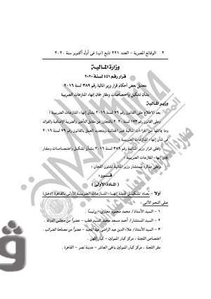 نشرت جريدة الوقائع المصرية في عددها رقم 221 تابع (أ)، الصادر في أول أكتوبر 2020، قرار وزارة المالية رقم 451 لسنة 2020، بتعديل بعض أحكام قرار وزير المالية رقم 389 لسنة 2016، بشأن تشكيل واختصاصات ومقار لجان إنهاء المنازعات الضريبية.