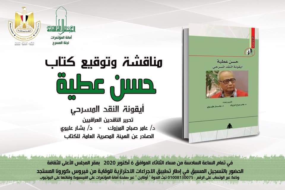 ينظم المجلس الأعلي للثقافة، بأمانة الدكتور هشام عزمي ،و الدكتور حاتم حافظ مقرر لجنة المسرح بالمجلس، أمسية لمناقشة وتوقيع كتاب (حسن عطية أيقونة النقد المسرحي) تحرير الناقدين العراقيين : الدكتور عامر المرزوك، والدكتور بشار عليوي، والصادر عن الهيئة المصرية العامة للكتاب برئاسة الدكتور هيثم الحاج علي.