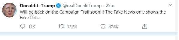 وكتب ترامب: «سنعود إلى مسار الحملة قريبًا!!! تظهر الأخبار الكاذبة واستطلاعات الرأي الوهمية فقط».