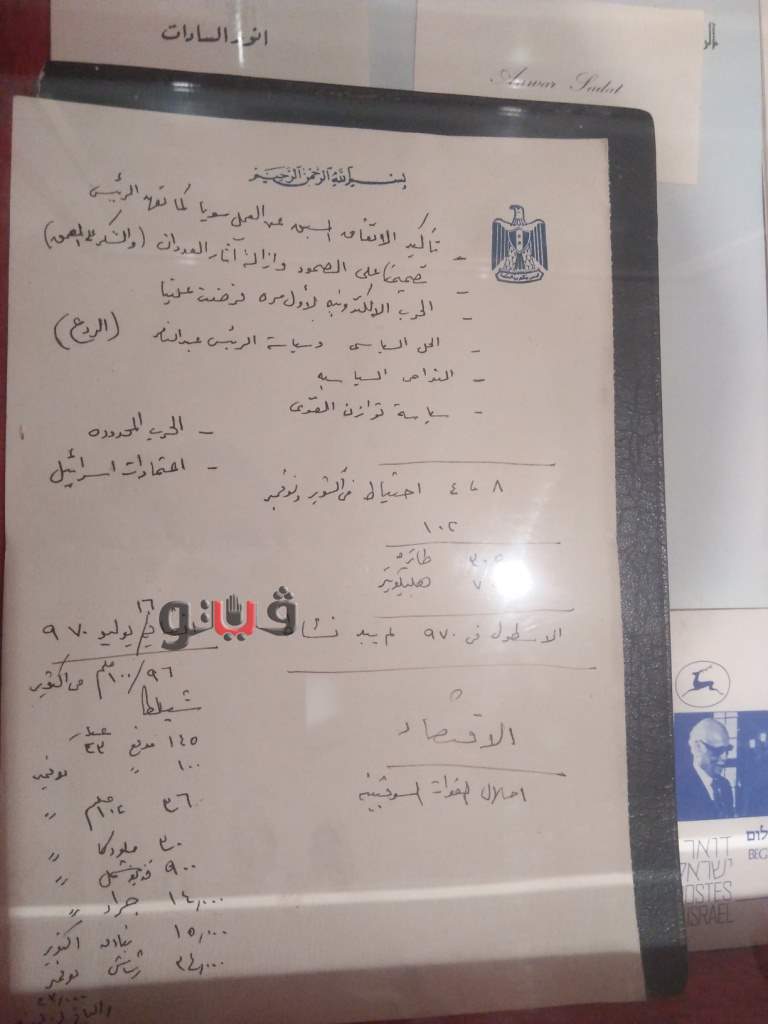 داخل متحف السادات بميت أبو الكوم توجد خطة حرب أكتوبر بخط يد الرئيس الراحل تضمنت عدد الطائرات فى ذلك الوقت والوضع الاقتصادى للبلاد وخوض حرب محدودة.