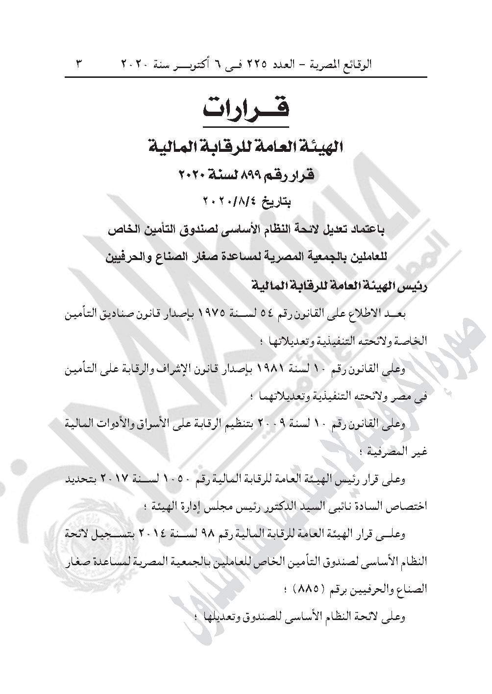 القرار رقم 899 لسنة 2020 باعتماد تعديل لائحة النظام الأساسي لصندوق التأمين الخاص للعاملين بالجمعية المصرية لمساعدة صغار الصناع والحرفيين.