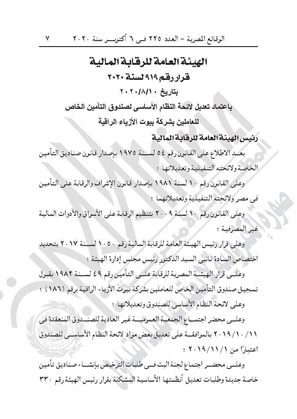 والقرار رقم 919 لسنة 2020، باعتماد تعديل لائحة النظام الأساسي لصندوق التأمين الخاص للعاملين بشركة بيوت الأزياء الراقية.