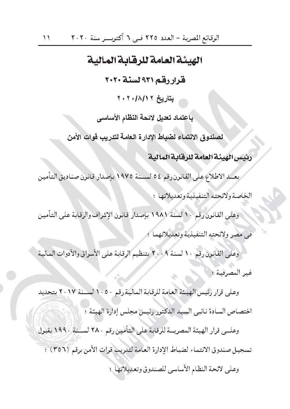والقرار رقم 931 لسنة 2020، باعتماد تعديل لائحة النظام الأساسي لصندوق الانتماء لضباط الإدارة العامة لتدريب قوات الأمن.