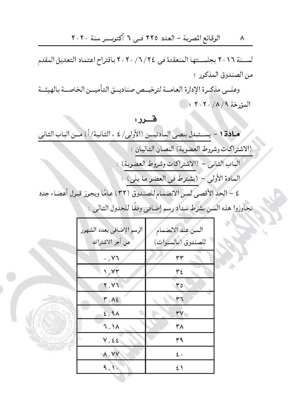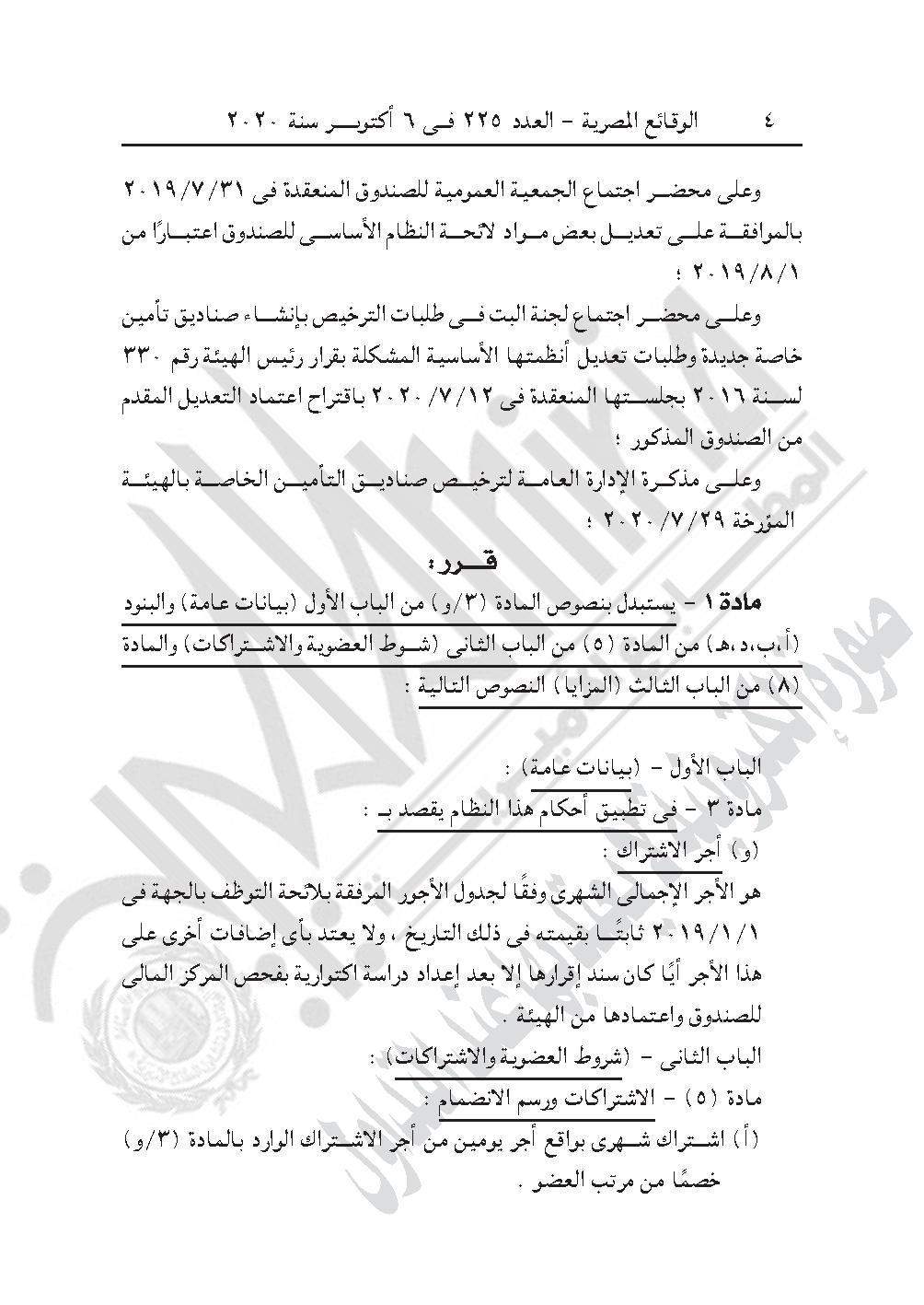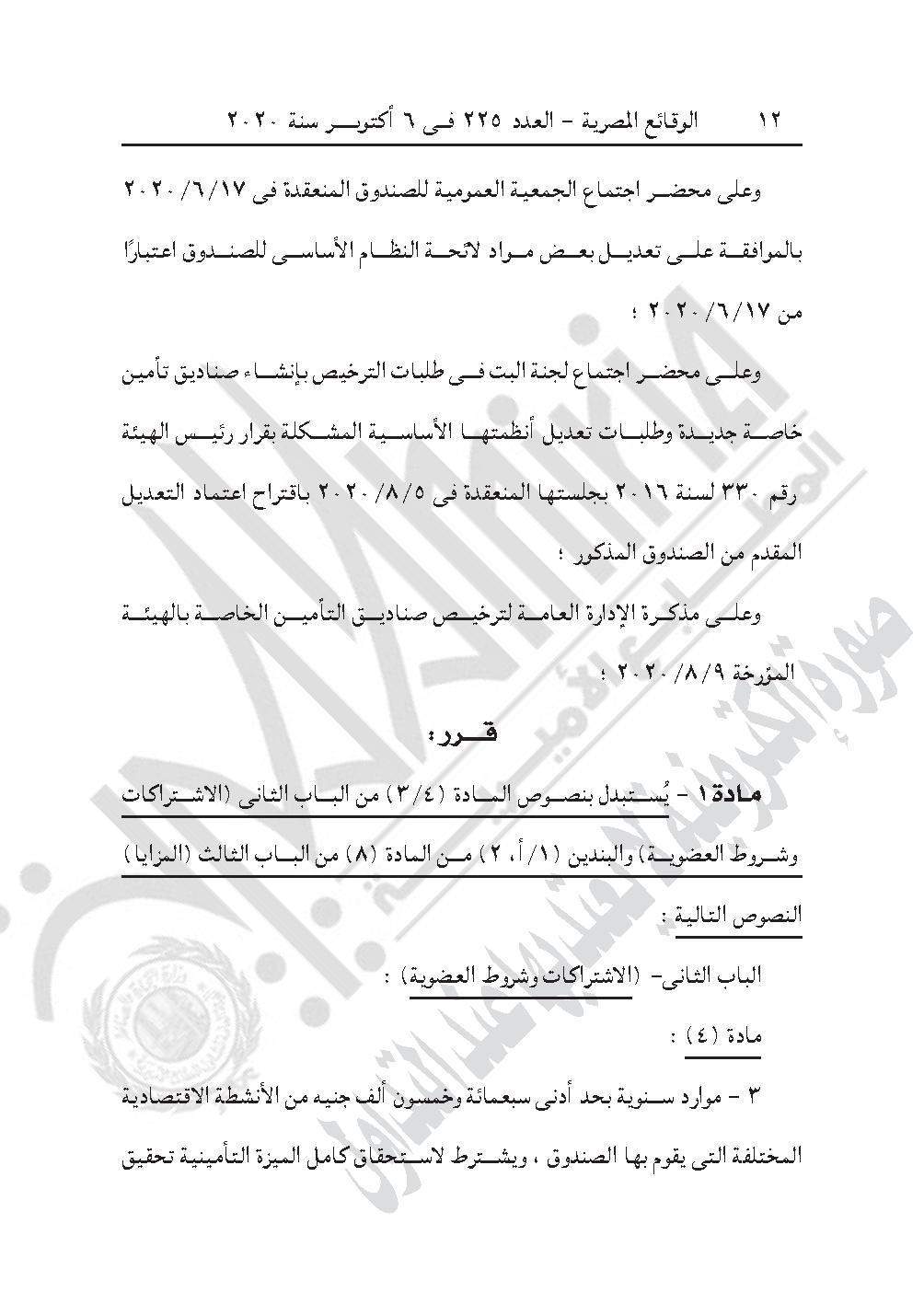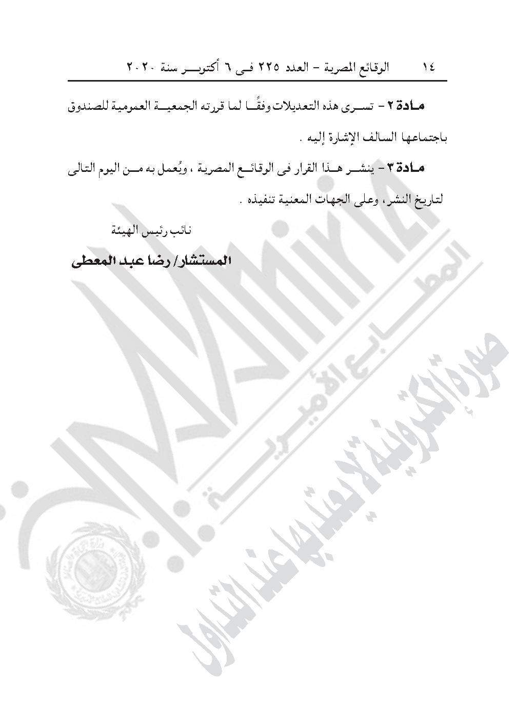 نشرت جريدة الوقائع المصرية في عددها رقم 225، الصادر في 6 أكتوبر 2020، 3 قرارات للهيئة العامة للرقابة المالية، بشأن اعتماد لائحة النظام الأساسي لصندوق تأمين العاملين بجمعية مساعدة صغار الحرفيين وشركة بيوت الأزياء الراقية، وصندوق الانتماء لضباط الإدارة العامة لتدريب قوات الأمن.