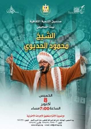 يقيم مركز ابداع بيت السحيمي بشارع المعز، التابع لقطاع صندوق التنمية الثقافية، في السابعة مساء الخميس المقبل الموافق 8 أكتوبر الجاري، حفل المنشد الديني محمود الحديوي.