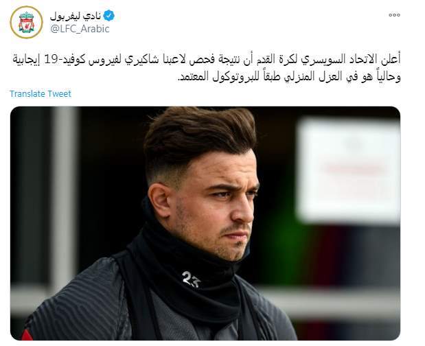 أكد نادي ليفربول الانجليزي، عبر حسابه الرسمي بتويتر، إصابة لاعبه شاكيري بفيروس كورونا المستجد كوفيد-19، مؤكدًا على بقاء اللاعب في العزل المنزلي طبقاً للبروتوكول العلاجي المعتمد.