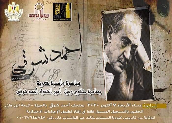 ينظم المجلس الأعلي للثقافة، بأمانة الدكتور هشام عزمي، والدكتور محمد أبو الفضل بدران، مقرر لجنة الشعر بالمجلس، ندوة وأمسية شعرية بمناسبة ذكرى رحيل "أمير الشعراء" أحمد شوقي.