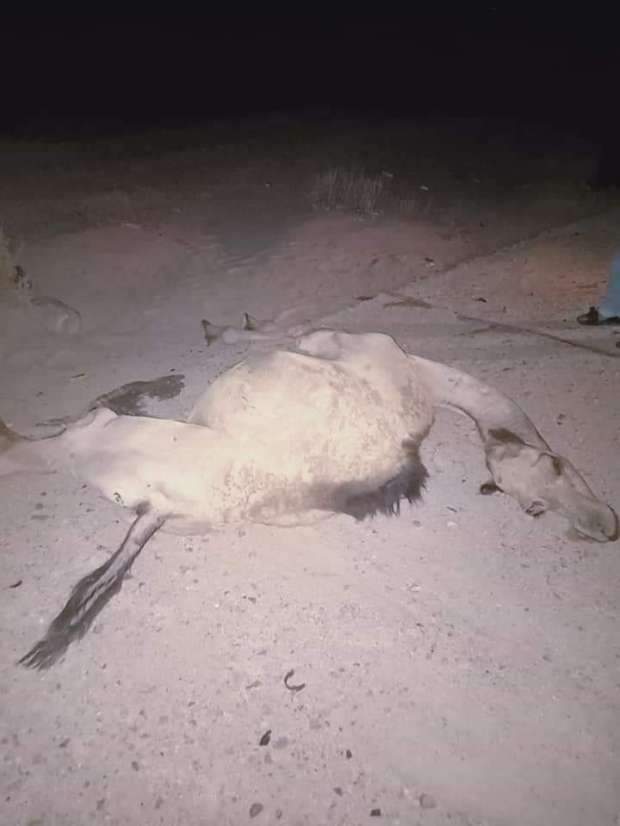 نفق 4 جمال إثر تصادم أتوبيس يقل 36 راكبا بقطيع من الجمال على الطريق الدولي شرم الشيخ - الطور في نفوق 4 جمال.