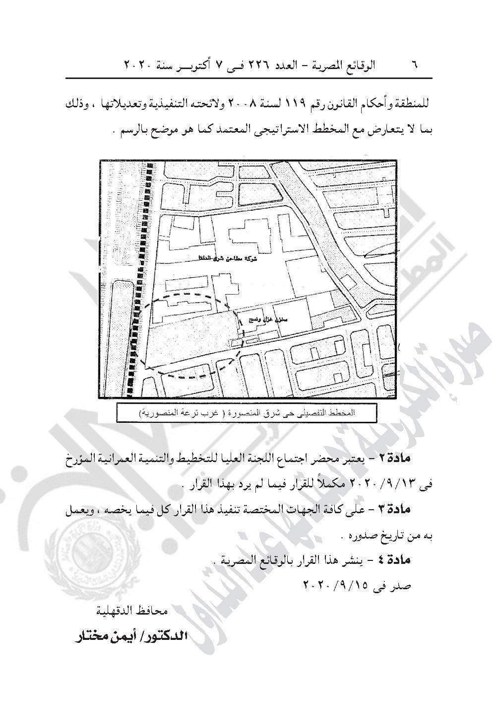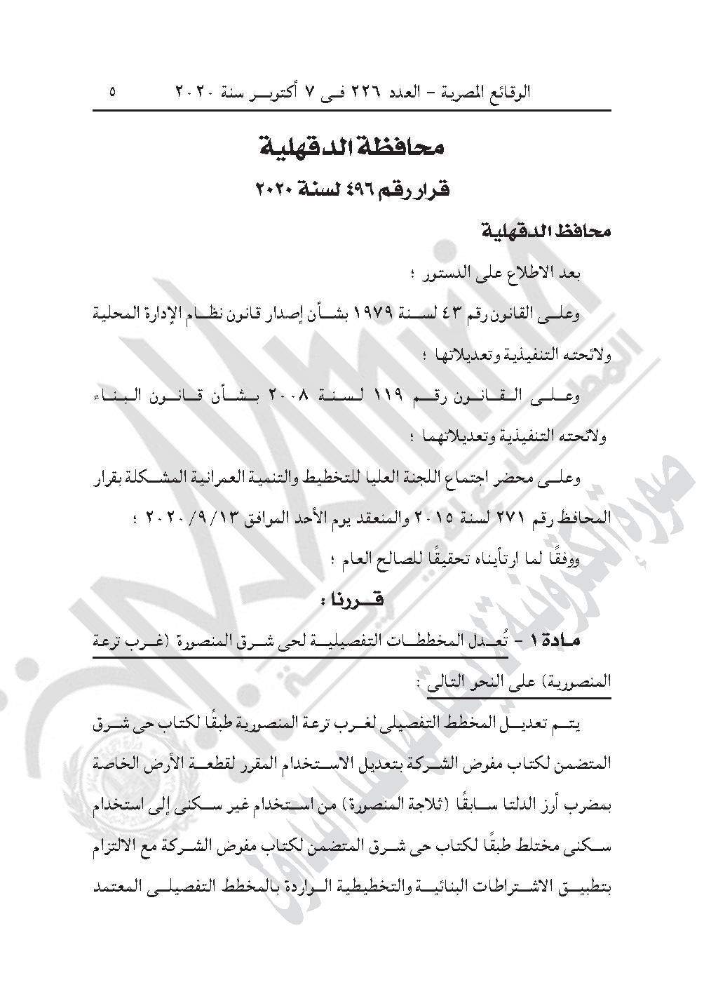 نشرت جريدة الوقائع المصرية في عددها رقم 226، الصادر في 7 أكتوبر 2020، قرار محافظة الدقهلية رقم 496 لسنة 2020، بتعديل المخططات التفصيلية لحي شرق المنصورة (غرب ترعة المنصورية).