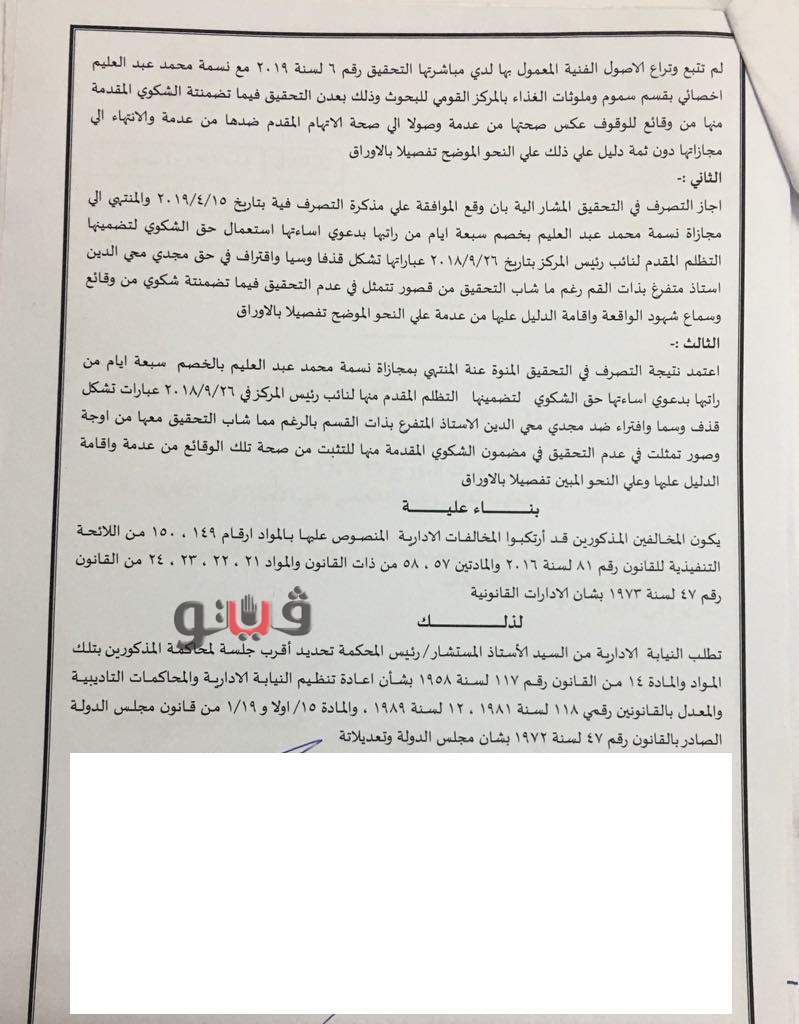 وأجاز علاء فتحي فرج، مدير التحقيقات التصرف فى التحقيق المشار إليه بأن وقع الموافقة على مذكرة التصرف فيه بتاريخ 15 أبريل 2019 والمنتهى إلى مجازاة نسمة محمد عبد العليم بخصم سبعة أيام من راتبها بدعوى إساءتها إستعمال حق الشكوى لتضمينها التظلم المقدم لنائب رئيس المركز بتاريخ 26 سبتمبر 2018 عبارات تشكل قذفاً وسباً، وإقتراف فى حق مجدى محيي الدين الأستاذ المتفرغ بذات القسم، رغم ما شاب التحقيق من قصور تتمثل فى عدم التحقيق فيما تضمنته شكوى من وقائع وسماع شهود الواقعة وإقامة الدليل عليها من عدمه.