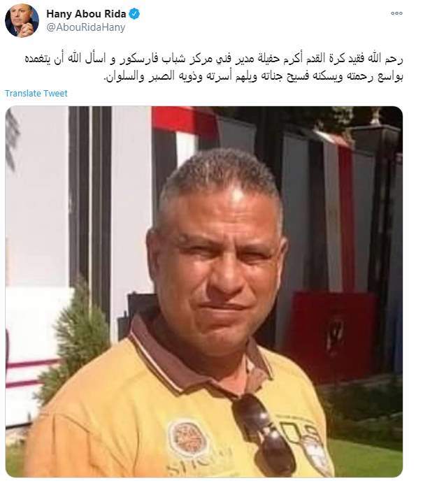 وكتب هاني أبو ريدة تغريدة على تويتر "رحم الله فقيد كرة القدم أكرم حفيلة مدير فني مركز شباب فارسكور واسأل الله أن يتغمده بواسع رحمته ويسكنه فسيح جناته ويلهم أسرته وذويه الصبر والسلوان"