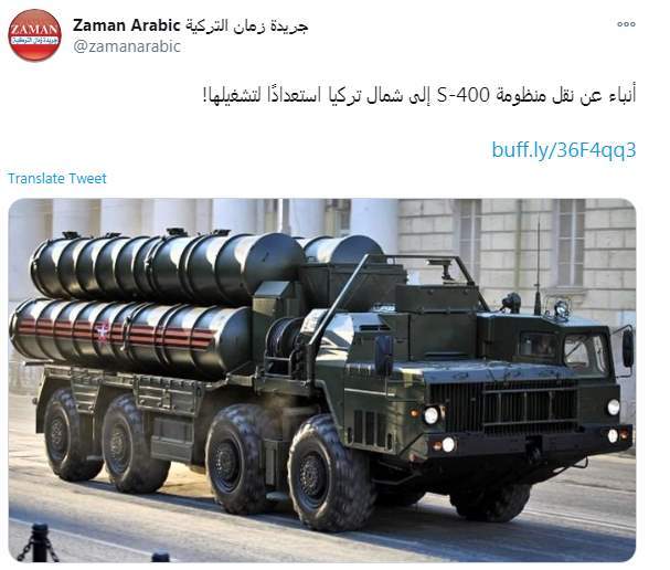 كما أوضحت صحيفة "زمان" التركية أن بعض التقارير الإخبارية التركية، مستندة إلى "مصادر خاصة"، ذكرت أن الجيش التركي نقل بطاريات منظومة الدفاع الجوي الصاروخية الروسية S-400 إلى مدينة سينوب، أقصى شمال تركيا استعدادًا لاختبارها.