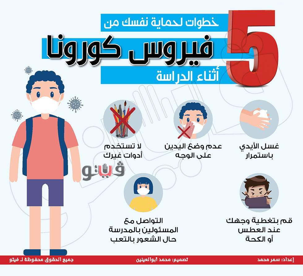 5 خطوات لحماية نفسك من فيروس كورونا أثناء الدراسة | إنفوجراف الأربعاء 07/أكتوبر/2020 - 07:05 م 10/7/2020 7:05:00 PM 5 خطوات لحماية نفسك من فيروس كورونا أثناء الدراسة شارك طباعة 18 حجم الخط شارك طباعة فيروس كورونا كورونا عودة المدارس