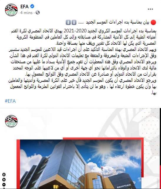 وفي بيان للاتحاد المصري لكرة القدم بمناسبة بدء إجراءات الموسم الجديد كتب تدوينة على الفيس بوك قال فيها: "بمناسبة بدء إجراءات الموسم الكروي الجديد 2020-2021 يهدي الاتحاد المصري لكرة القدم أمنياته الطيبة إلى كل الأندية المشاركة في مسابقاته وإلى كل العاملين في المنظومة الكروية المصرية التي يكن لها الاتحاد كل تقدير ويقف منها بمسافة واحدة".