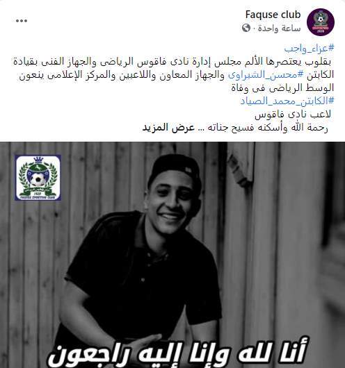 وقدم نادي فاقوس عبر صفحته على موقع التواصل الاجتماعي فيس بوك" العزاء للأسرة الرياضية في وفاة اللاعب محمد الصياد.