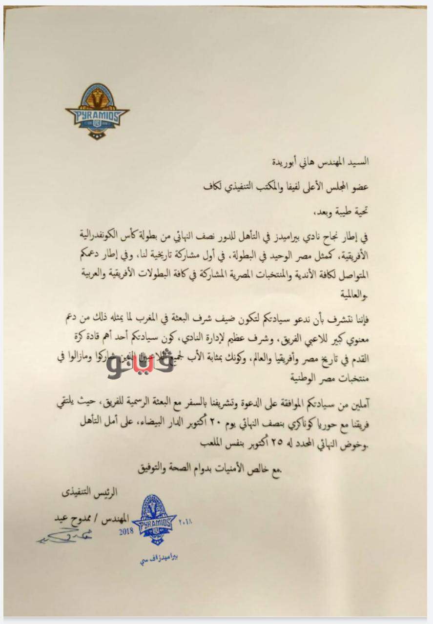وأرسل المهندس ممدوح عيد، المدير التنفيذي لنادي بيراميدز، الدعوة في خطاب رسمي إلى المهندس هاني أبو ريدة، ودعاه للسفر مع البعثة الرسمية للفريق، حيث يلتقي بيراميدز مع حوريا كوناكري بنصف النهائي يوم ٢٠ أكتوبر بالرباط، على أمل التأهل وخوض النهائي المحدد له ٢٥ أكتوبر بنفس الملعب، مشيرا في خطابه إلى نجاح نادي بيراميدز في التأهل للدور نصف النهائي من بطولة كأس الكونفدرالية الأفريقية، كممثل مصر الوحيد في البطولة، في أول مشاركة تاريخية للنادي، ومشددا على دعم أبوريدة المتواصل لكافة الأندية والمنتخبات المصرية المشاركة في كافة البطولات الأفريقية والعربية والعالمية.