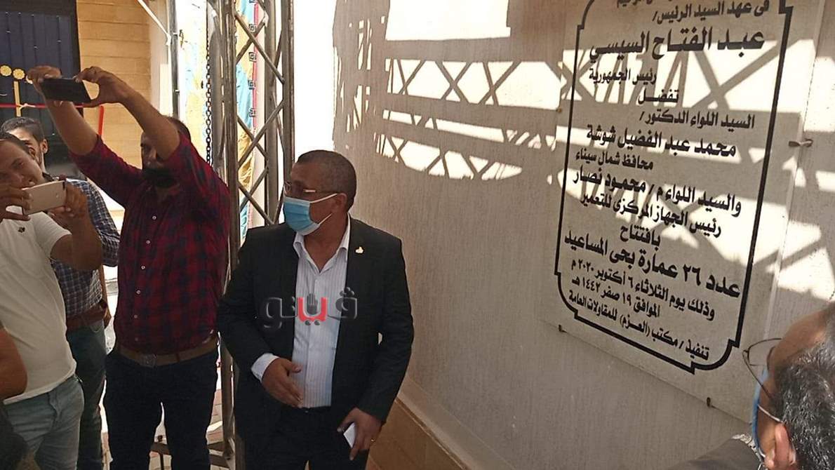 كما قام المحافظ يرافقه نائبة والمهندس ناجي إبراهيم رئيس جهاز تعمير شمال سيناء والمهندس محمد رضوان وكيل وزارة الإسكان بافتتاح المرحلة السابعة من إعادة بناء وتأهيل عمارات التعاونيات بحي المساعيد بمدينة العريش .