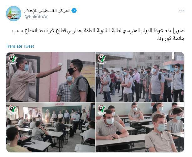 وكتب المركز الفلسطيني للإعلام تغريدة على تويتر " بدء عودة الدوام المدرسي لطلبة الثانوية العامة بمدارس قطاع غزة بعد انقطاع بسبب جائحة كورونا"