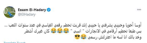 وكتب عصام الحضري تغريدة على تويتر "أوسا أخويا وحبيبي يشرفني يا حبيبي إنك قربت تحطم رقمي القياسي في عدد سنوات اللعب... بس طبعا تحطيم أرقامي في الانجازات " انسى " كان غيرك أشطر.. وخد بالك انا لسه ما اعتزلتش رسمي"