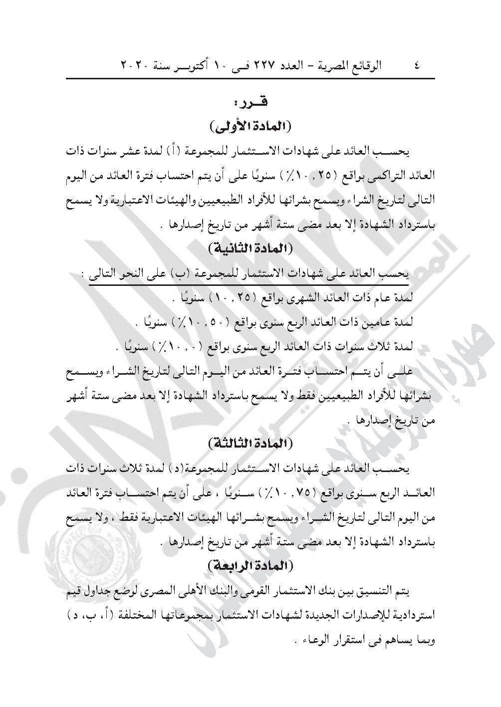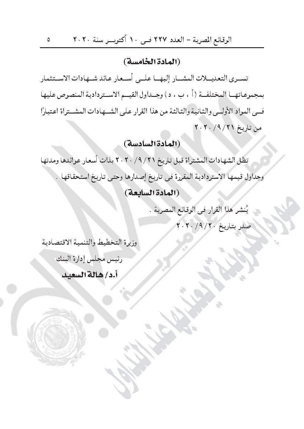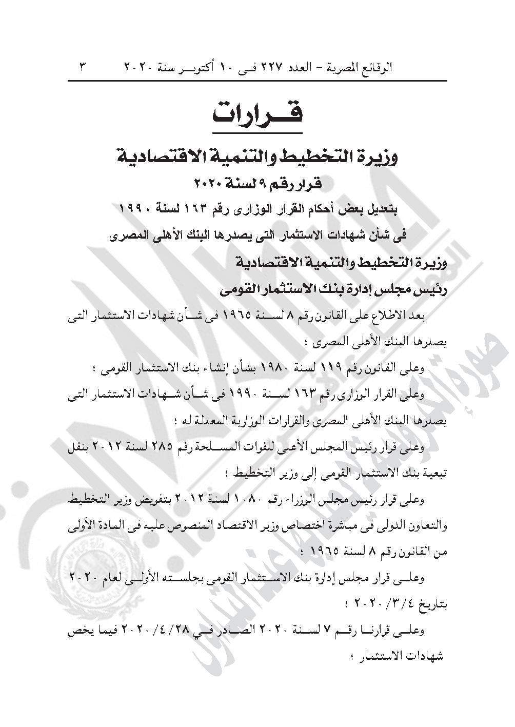نشرت جريدة الوقائع المصرية في عددها رقم 227، الصادر في 10 أكتوبر 2020، قرار وزيرة التخطيط والتنمية الاقتصادية رقم 9 لسنة 2020، بتعديل بعض أحكام القرار الوزارى رقم 163 لسنة 1990، في شأن شهادات الاستثمار التي يصدرها البنك الأهلي المصري.