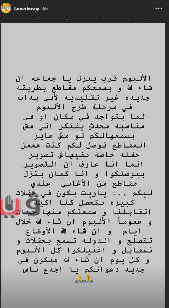 وكتب تامر «الألبوم قرب ينزل ياجماعة إن شاء الله وبسمعكم مقاطع بطريقة جديدة غير تقليدية لإني بدأت في مرحلة طرح الألبوم.. لما بتواجد في مكان أو مناسبة محدش يفتكر إني مش بسمعهالكم».