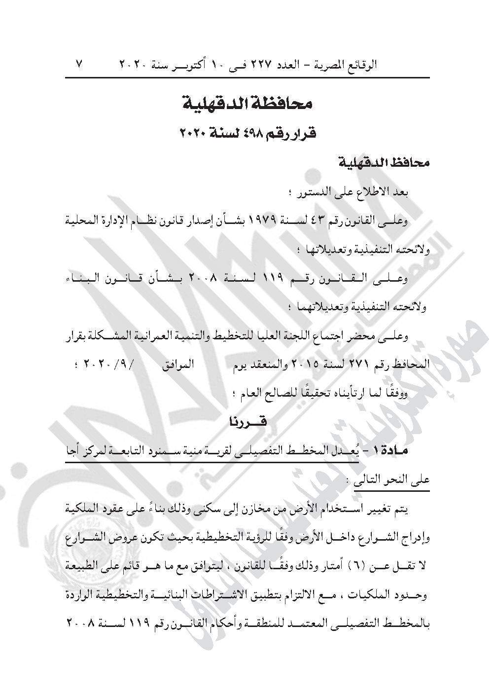 وينص القرار في مادته الأولي علي تعديل المخطط التفصيلي لقرية منية سمنود التابعة لمركز أجا، حيث يتم تغيير استخدام الأرض من مخازن إلى سكني، بناءً على عقود الملكية وإدراج الشوارع داخل الأرض وفقًا للرؤية التخطيطية، بحيث تكون عروض الشوارع لا تقل عن 6 أمتار.