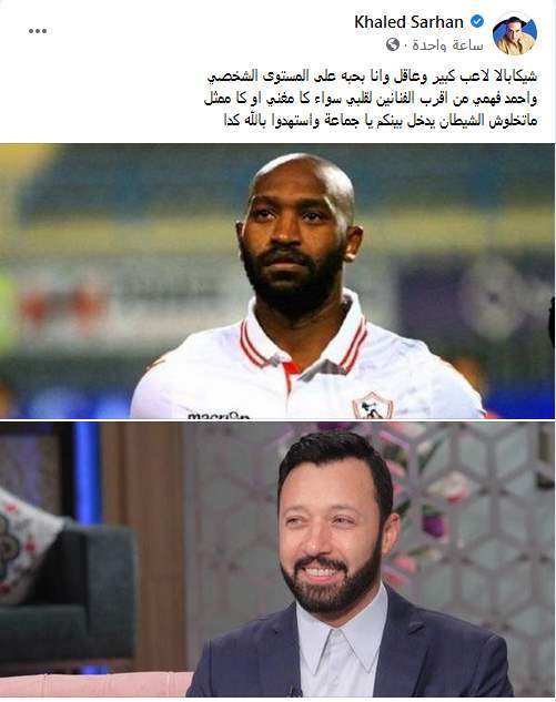 ونشر خالد سرحان المعروف بانتمائه للزمالك صورة لـ شيكا بالا عبر صفحته على موقع التواصل الاجتماعي فيس بوك، وصورة لأحمد فهمي المطرب وليس أحمد فهمي الممثل أحد طرفي الأزمة وعلق قائلا: شيكابالا لاعب كبير وعاقل وانا بحبه على المستوى الشخصي، وأحمد فهمي من أقرب الفنانين لقلبي سواء كمغني أو كممثل ماتخلوش الشيطان يدخل بينكم يا جماعة واستهدوا بالله كده".