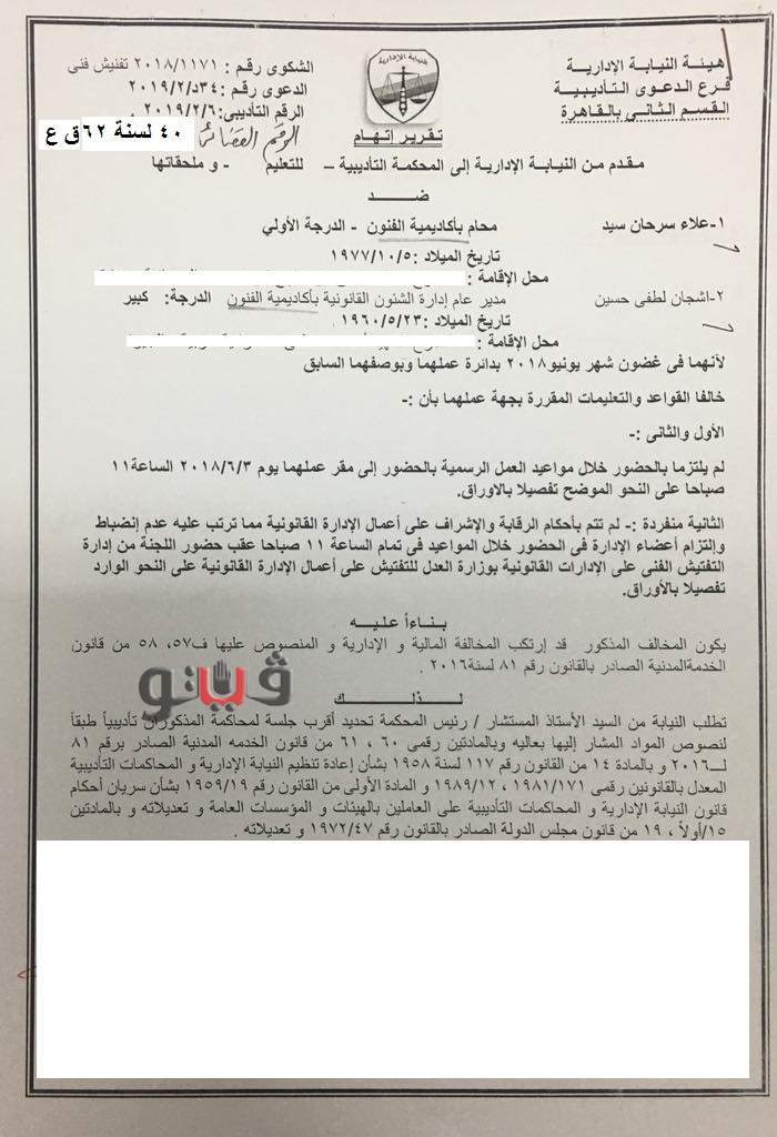إحالة مدير عام الشئون القانونية بأكاديمية الفنون ومحام للمحاكمة