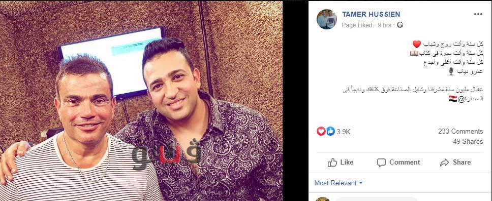 هنأ الشاعر تامر حسين المطرب عمرو دياب بعيد ميلاده عبر صفحته الشخصية علي موقع التواصل الإجتماعي "فيس بوك".