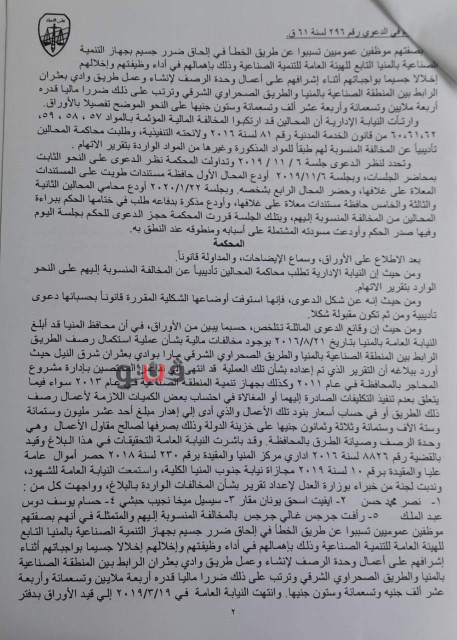 وكشفت المحكمة أنهم بوصفهم موظفين عموميين لم يتسببوا عن طريق الخطأ في الحاق ضرر جسيم بجهاز التنمية الصناعية بالمنيا التابه للهيئة العامة للتنمية الصناعية، وذلك بإهمالهم في أداء وظائفهم وإخلالهم إخلالًا جسيمًا بواجباتهم أثناء إشرافهم على أعمال وحدة الرصف لإنشاء وعمل طريق وادي بعثران الرابط بين المنطقة الصناعية بالمنيا والطريق الصحراوي الشرقي.