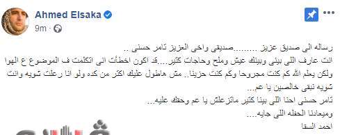وكتب السقا «رساله الى صديق عزيز صديقى واخى العزيز تامر حسنى ..