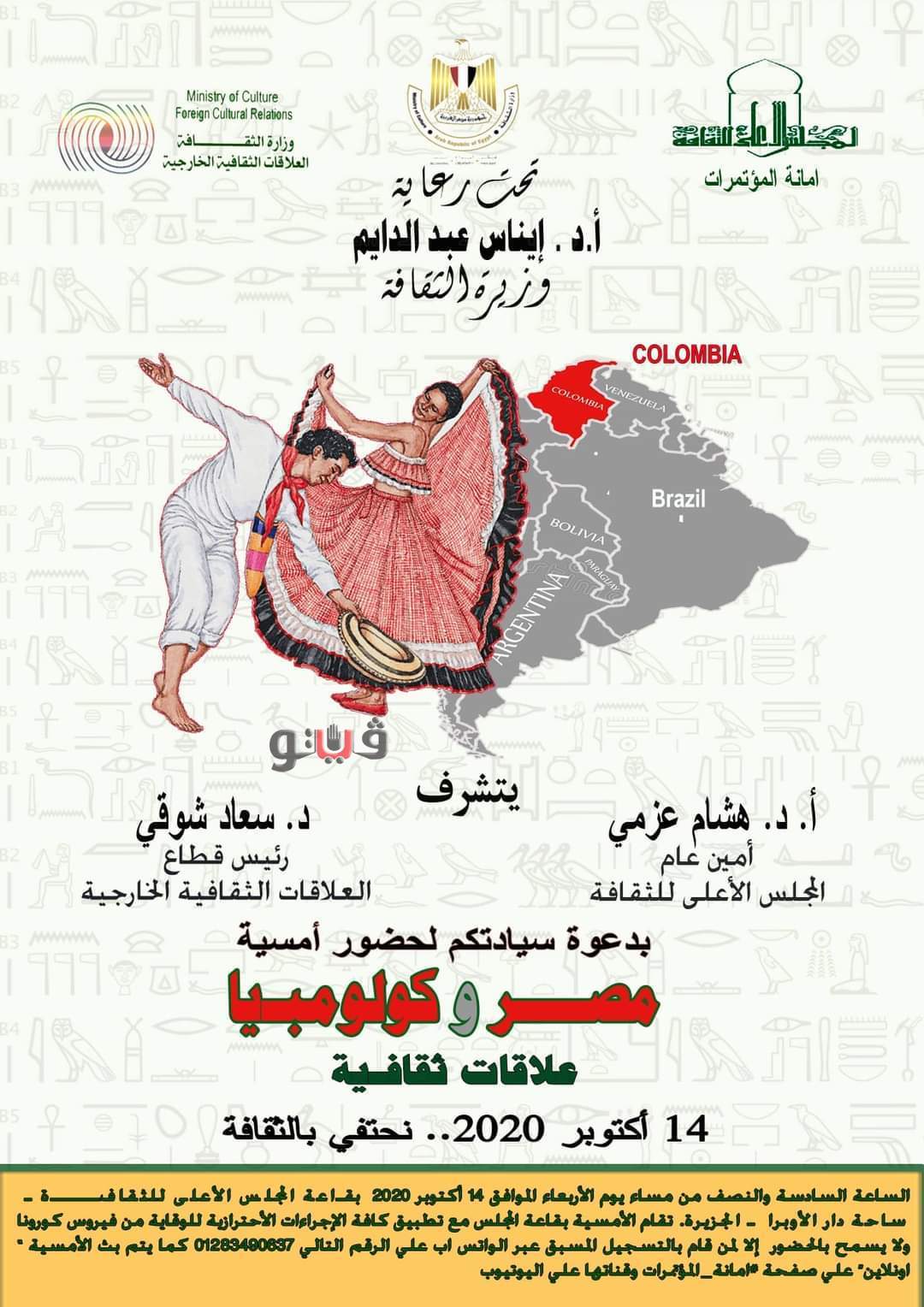 ينظم قطاع العلاقات الثقافية الخارجية، بالتعاون مع المجلس الأعلى للثقافة، مساء الأربعاء المقبل، في تمام السادسة والنصف مساءً، أمسية ثقافية بعنوان "مصر و كولومبيا - علاقات ثقافية".
