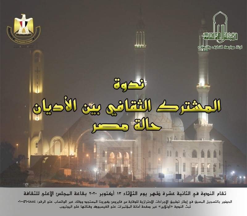 ينظم المجلس الأعلى للثقافة، بأمانة الدكتور هشام عزمي، وبإشراف لجنة مواجهة التطرف والإرهاب برئاسة المستشارة تهاني الجبالي، ندوة: "المشترك الثقافي بين الأديان.. حالة مصر"؛ وذلك في تمام الثانية عشرة من ظهر يوم الثلاثاء المقبل.
