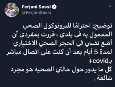 وقال اللاعب عبر حسابه بـ"تويتر": "احترامًا للبروتوكول الصحي المعمول به في بلدي، قررت بمفردي أن أضع نفسي في الحجر الصحي الاختياري لمدة 5 أيام بعد أن كنت على اتصال مباشر بـcovid +، وكل ما يدور حول حالتي الصحية هو مجرد شائعة".