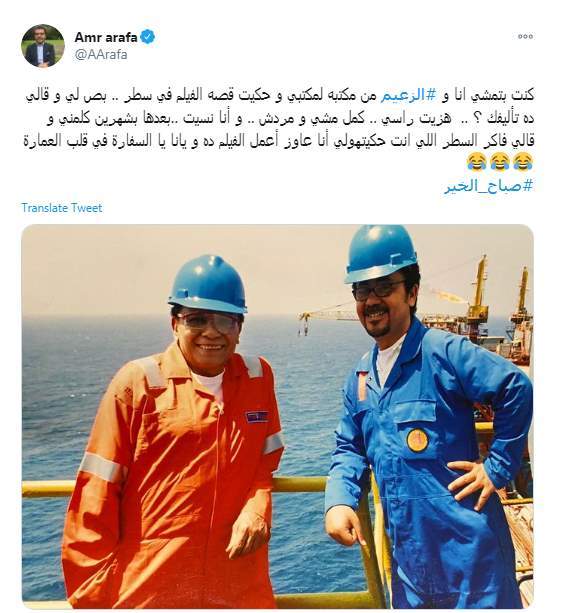 وكتب عمرو عرفة تغريدة على تويتر: "كنت بتمشي انا و #الزعيم من مكتبه لمكتبي وحكيت قصة الفيلم في سطر .. بص لي و قالي ده تأليفك ؟ .. هزيت راسي .. كمل مشي و مردش .. و أنا نسيت ..بعدها بشهرين كلمني و قالي فاكر السطر اللي انت حكيتهولي أنا عاوز أعمل الفيلم ده و يانا يا السفارة في قلب العمارة".
