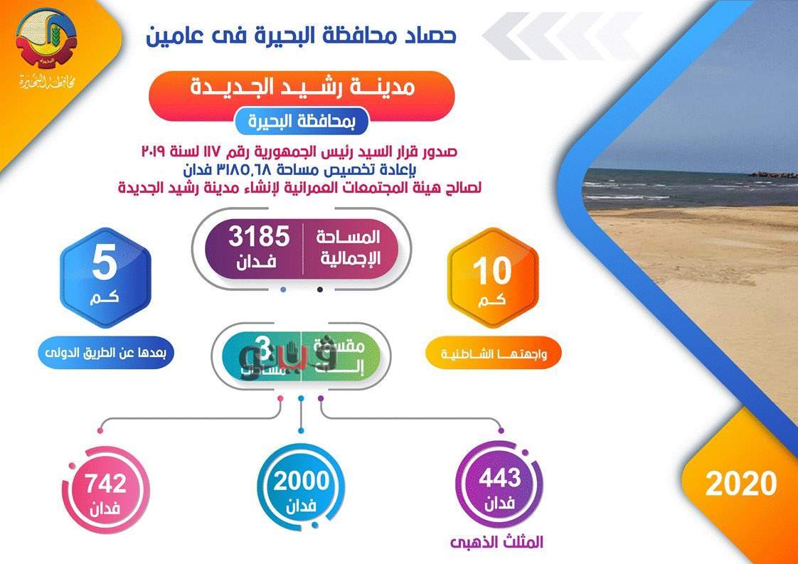 وفى انفوجراف اخر نشره المكتب الاعلامى بشان مدينة رشيد الجديدة والتى صدر قرار رئيس الجمهورية رقم ١١٧ لسنه ٢٠١٩ بإعادة تخصيص مساحة ٣١٨٥ فدان لصالح هيئة المجتمعات العمرانية لإنشاء مدينة رشيد الجديدة بواجهة شاطئية بطول 10 كم وتبعد عن الطريق الدولى 5 كم ومقسمه الي ٣ مساحات منها ٤٤٣ فدان بمنطقة المثلث الذهبي.