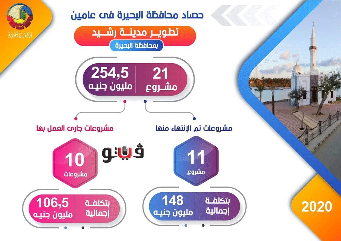 وفيما يخص اعمال تطوير مدينة رشيد أوضح انفوجراف اخر أن اجمالى عدد المشاريع الخاصة بتطوير المدينة تبلغ 21 مشروع بتكلفة تتجاوز 254 مليون جنية تم الإنتهاء من ١١ مشروع منها بتكلفه اجمالية ١٤٨ مليون جنيه وجاري العمل بعدد ١٠ مشاريع بتكلفه اجمالية ١٠٦ مليون و ٥٠٠ الف جنيه