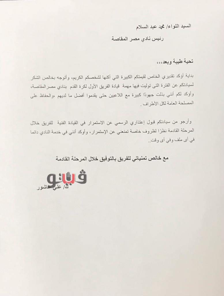 وتابع الخطاب:"ارجو من سيادتكم قبول اعتذاري عن الاستمرار في القيادة الفنية للفريق خلال المرحلة المقبلة نظرا لظروف تمنعني من الاستمرار واؤكد انني في خدمة النادي دائما في اي وقت".
